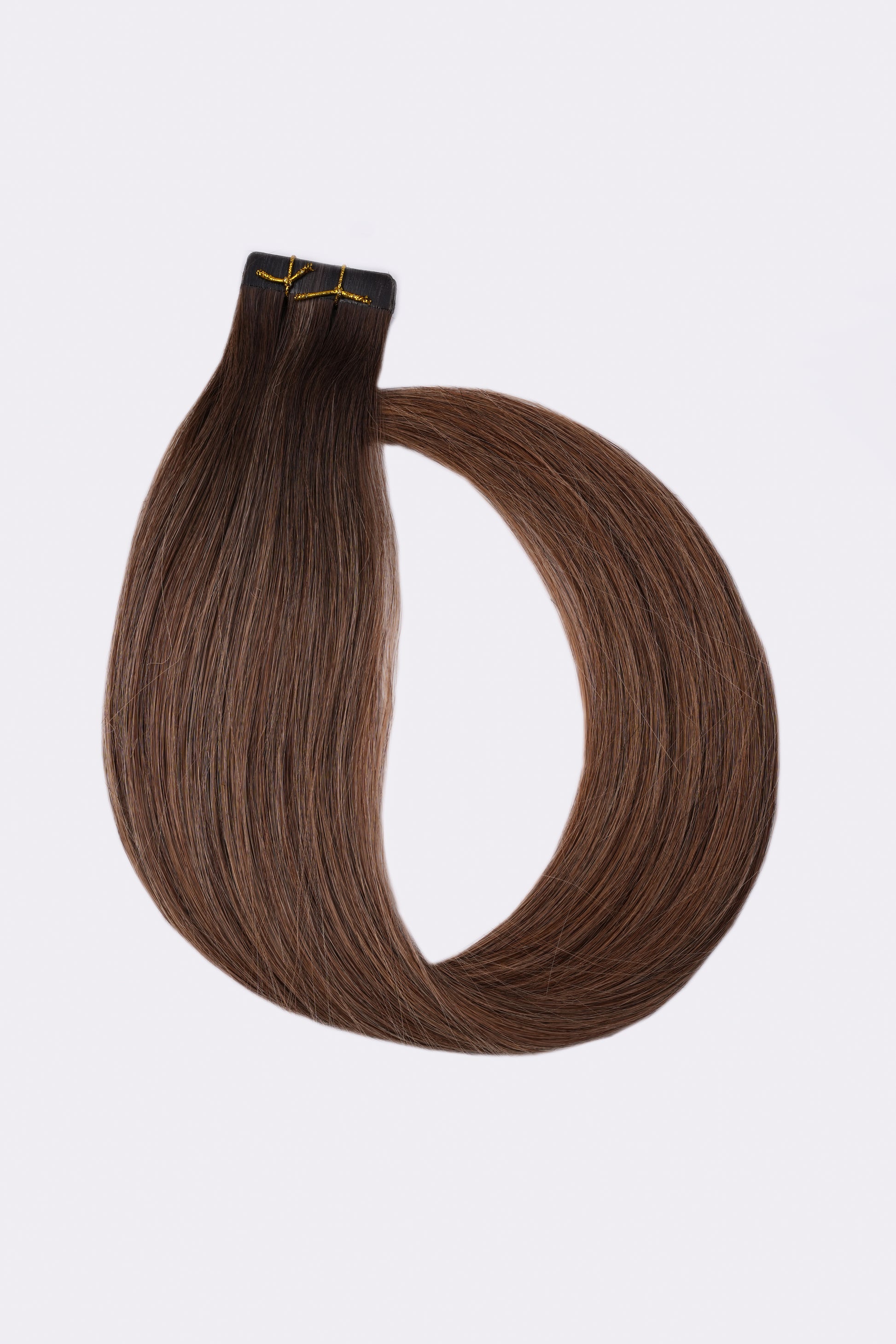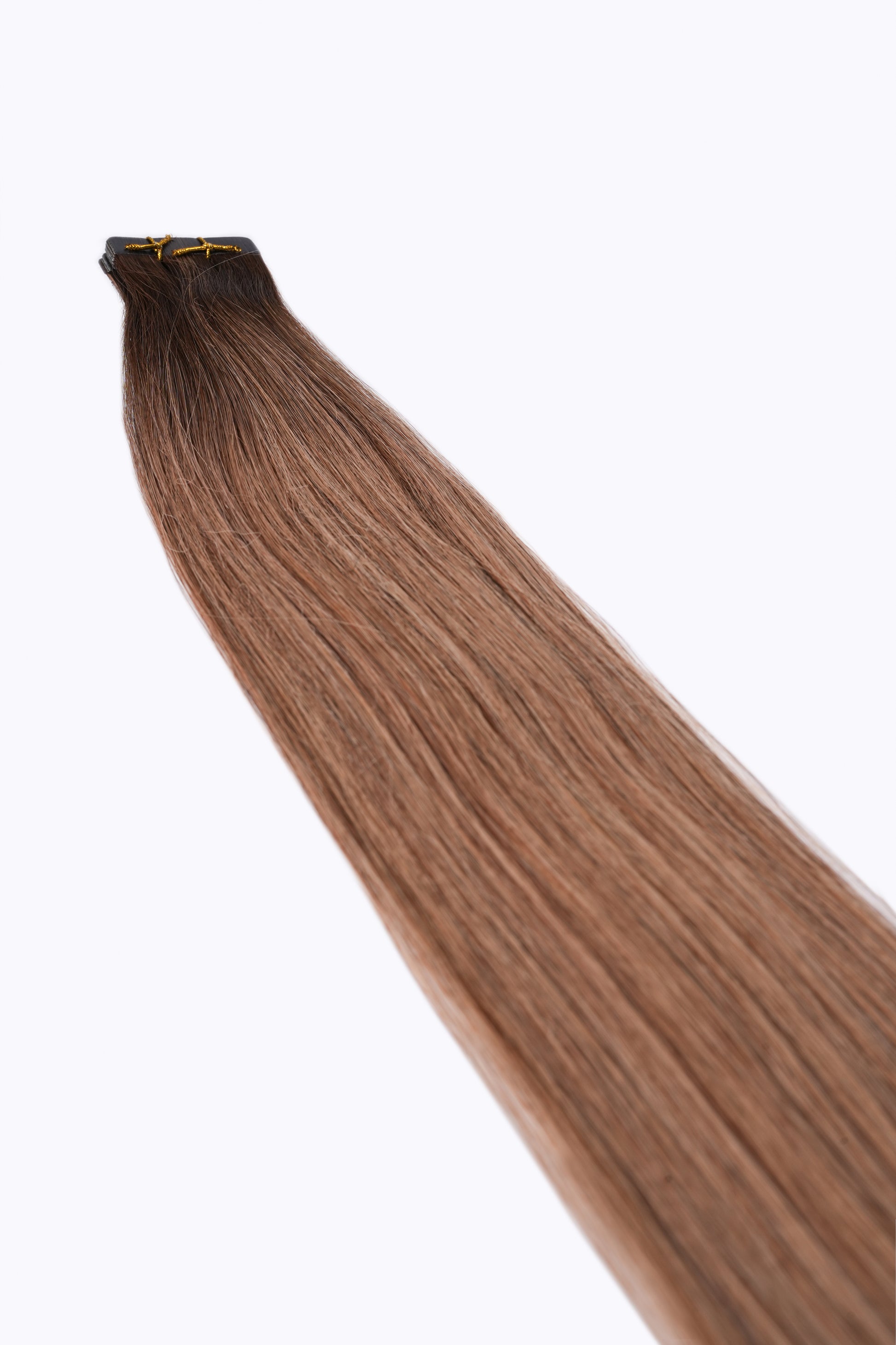 Unsere Tape-In-Extension mit dunkelbraunem Ansatz und sanftem Verlauf ins Hellbraun schaffen einen eleganten Farbverlauf, der perfekt zu vielen natürlichen Haartönen passt.
